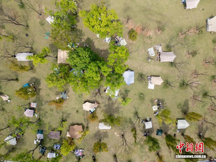 4月5日,4川成皆,市平易近正在兴盛湖畔扎堆露营,乐享清朗小少假。(无人机相片)中新社记者 弛浪 摄